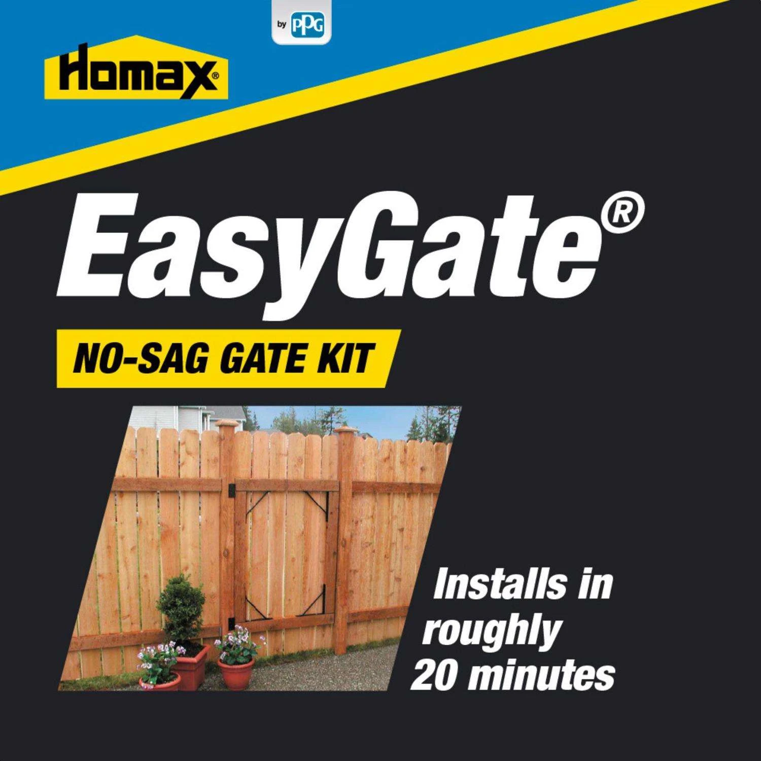 Homax EasyGate No-Sag Gate Kit enables any homeowner to build a sag-free gate frame in as little as 20 minutes. The kit includes 4 gate brackets with attached hinges and screws for easy assembly. Hinges and screws are constructed of powder-coated steel in a black finish to resist rust. Use with openings of 25″ to 72″ wide and there’s no height restrictions. Left or right swing Hinges and screws are constructed Use with openings of 25 in. to 72 in. wide Salt-spray tested, weather and rust-resistant No Z-bracing required No angled cuts needed